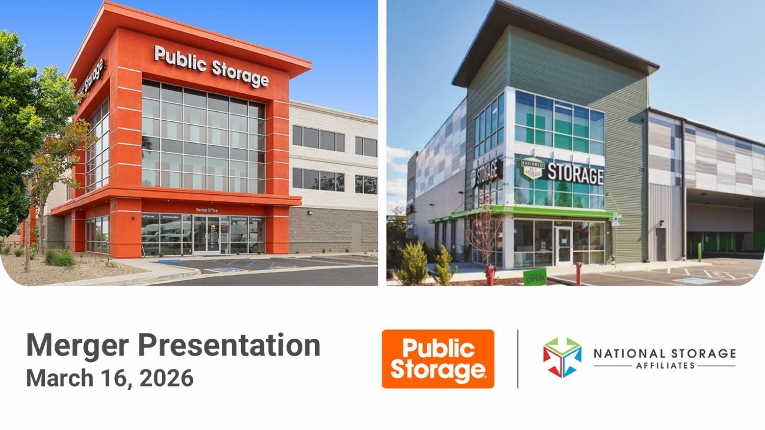 14 Important Information Participants in the Solicitation NSA, Public Storage, their respective trustees and certain of their respective executive officers may be deemed to be partici pan ts in the solicitation of proxies from NSA’s shareholders in respect of the proposed transaction. Information about the trust ees and executive officers of NSA, including a description of their direct or indirect interests, by security holdings or otherwise, is set forth in NSA’s proxy st atement for its 2025 Annual Meeting of Shareholders under the headings “Our Board,” “How We Are Paid,” “Compensation Discussi on and Analysis,” “Summary Compensation and Other Tables,” “Severance and Change in Control Arrangements,” “Certain Relationships and Related Transactio ns” and “Shareholder Ownership Information,” which was filed with the SEC on March 28, 2025 , and in NSA’s Annual Report on Form 10 - K for the fiscal year ended December 31, 2025, which was filed with the SEC on February 26, 2026 . To the extent holdings of NSA’s securities by its trustees or executive officers have changed since the amounts set forth i n N SA’s definitive proxy statement for its 2025 Annual Meeting of Shareholders, such changes have been or will be reflected on an Initial Statement of Beneficial Ownership of Securities on Form 3, Statement of Cha nges in Beneficial Ownership on Form 4 or Annual Statement of Changes in Beneficial Ownership on Form 5, in each case filed w ith the SEC, and available on the SEC’s website at www.sec.gov. Information about the trustees and executive officers of Public Storage, including a descriptio n o f their direct or indirect interests, by security holdings or otherwise, is set forth in Public Storage’s proxy statement for it s 2025 Annual Meeting of Shareholders under the headings “2024 Trustee Compensation,” “Our Named Executive Officers,” “Compensation Discussion and Analysis,” “Exec uti ve Compensation Tables,” “Potential Payments Upon Termination or Change in Control,” “Outstanding Equity Awards at 2024 Fisca l Y ear End,” “Related Person Transactions” and “Share Ownership of Trustees and Management,” which was filed with the SEC on March 28, 2025 , in Public Storage’s Annual Report on Form 10 - K for the fiscal year ended December 31, 2025, which was filed with the SEC on February 12, 2026 , in Public Storage’s Form 8 - K filed with the SEC on July 30, 2025 , and in Public Storage’s Form 8 - K filed with the SEC on February 12, 2026 . To the extent holdings of Public Storage’s securities by its trustees or executive officers have changed since the amounts set forth in Public Storage’s definitive proxy statement for its 2025 Annual Meeting of Shareholders, such changes have been or will be reflected on an Initial Statement of Be neficial Ownership of Securities on Form 3, Statement of Changes in Beneficial Ownership on Form 4, or Annual Statement of Ch ang es in Beneficial Ownership on Form 5, in each case filed with the SEC and available on the SEC’s website at www.sec.gov. Other information regarding the pa rti cipants in the proxy solicitations and a description of their direct and indirect interests, by security holdings or otherwis e, will be contained in the Registration Statement, the Proxy Statement/Prospectus and other relevant materials to be filed with the SEC regarding the proposed transa cti on when such materials become available. Investors and security holders should read the Registration Statement and the Proxy Sta tement/Prospectus carefully when they become available before making any voting or investment decisions. You may obtain free copies of these documents fr om NSA or Public Storage using the sources indicated above.. Non - GAAP Measures This presentation contains non - GAAP measures, including FFO, NOI, and EBITDA . Non - GAAP measures should not be considered as an alternative to, or more meaningful than, net income (determined in accordance with GAAP) or other GAAP financial measures, as an indicator of financial performance and are not an alternative to, or more meaningful than, cash flow from operating activities (determined in accordance with GAAP) as a measure of liquidity . Non - GAAP measures have limitations as they do not include all items of income and expense that affect operations and, accordingly, should always be considered as presentational financial results to those presented in accordance with GAAP . In addition, other REITs may compute these measures differently, so comparisons among REITs may not be helpful . Please refer to Public Storage’s and National Storage Affiliates’ SEC periodic reports and the reconciliations attached to this presentation for definitions of these non - GAAP measures and reconciliations to the nearest GAAP measures .
