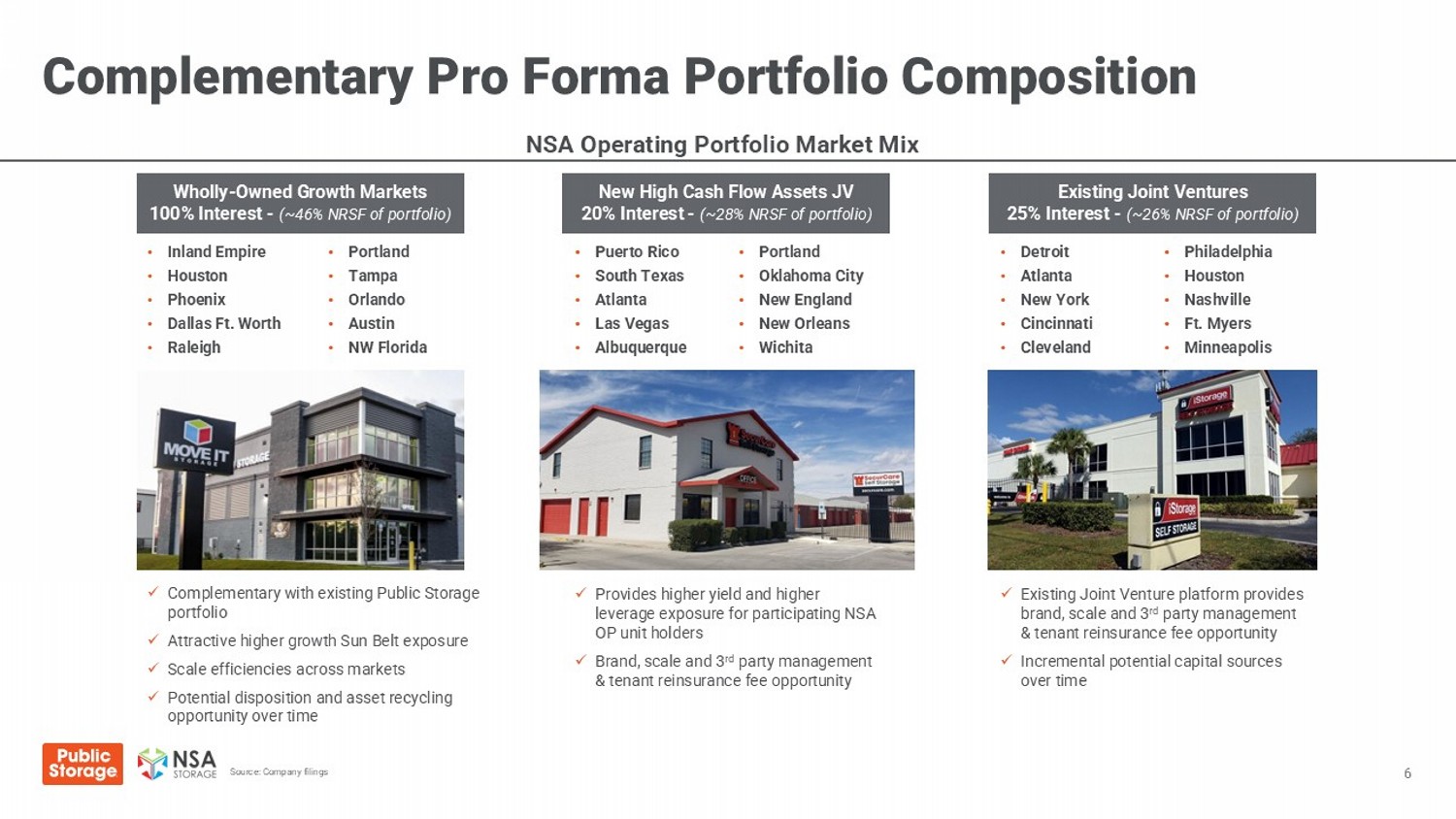 5 Growing Sunbelt & Core Markets to Deepen Physical & Digital Presence Property Presence Public Storage only National Storage Affiliates only Public Storage and National Storage Affiliates overlap Increase Combined Company Public Storage +30% 4,596 3,533 Total Properties +27% 328 million 258 million Total Square Feet +15% 3,659 3,171 Wholly - Owned Properties 2 +14% 260 million 229 million Wholly - Owned Square Feet 2 Overlapping Coverage and New Markets Across 42 States 1 Added Size in an Industry with Benefits of Coverage and Scale Source: Company filings 1. Includes Puerto Rico. Reflects consolidated portfolio overlapping coverage (i.e. Wholly - Owned + Joint Venture). 2. Wholly - Owned reflects the 488 properties acquired not under a Joint Venture structure. Wholly - Owned Portfolio (Pro Forma NOI) Change Combined Company Public Storage Regions +1.0% 38.0% 37.0% Sunbelt (0.6%) 48.9% 49.5% Coastal (0.4%) 13.1% 13.5% Midwest