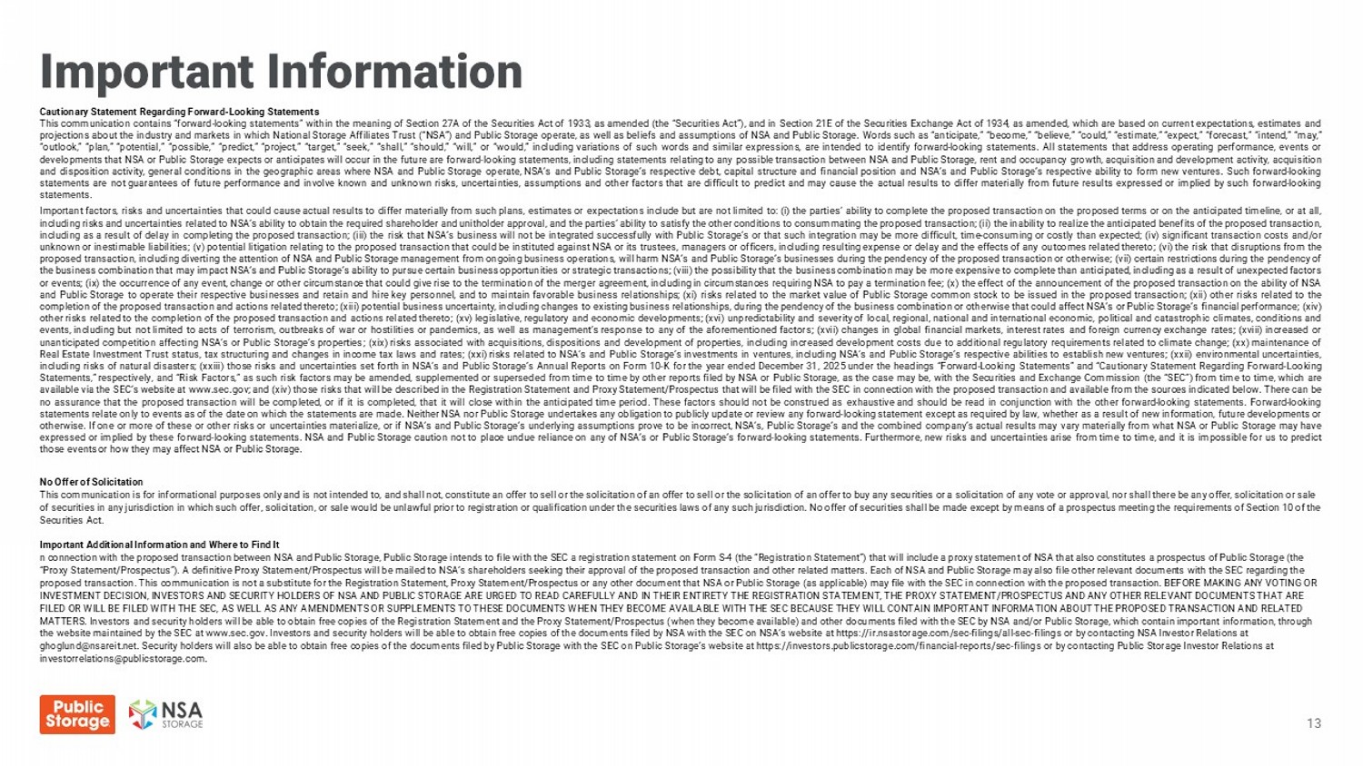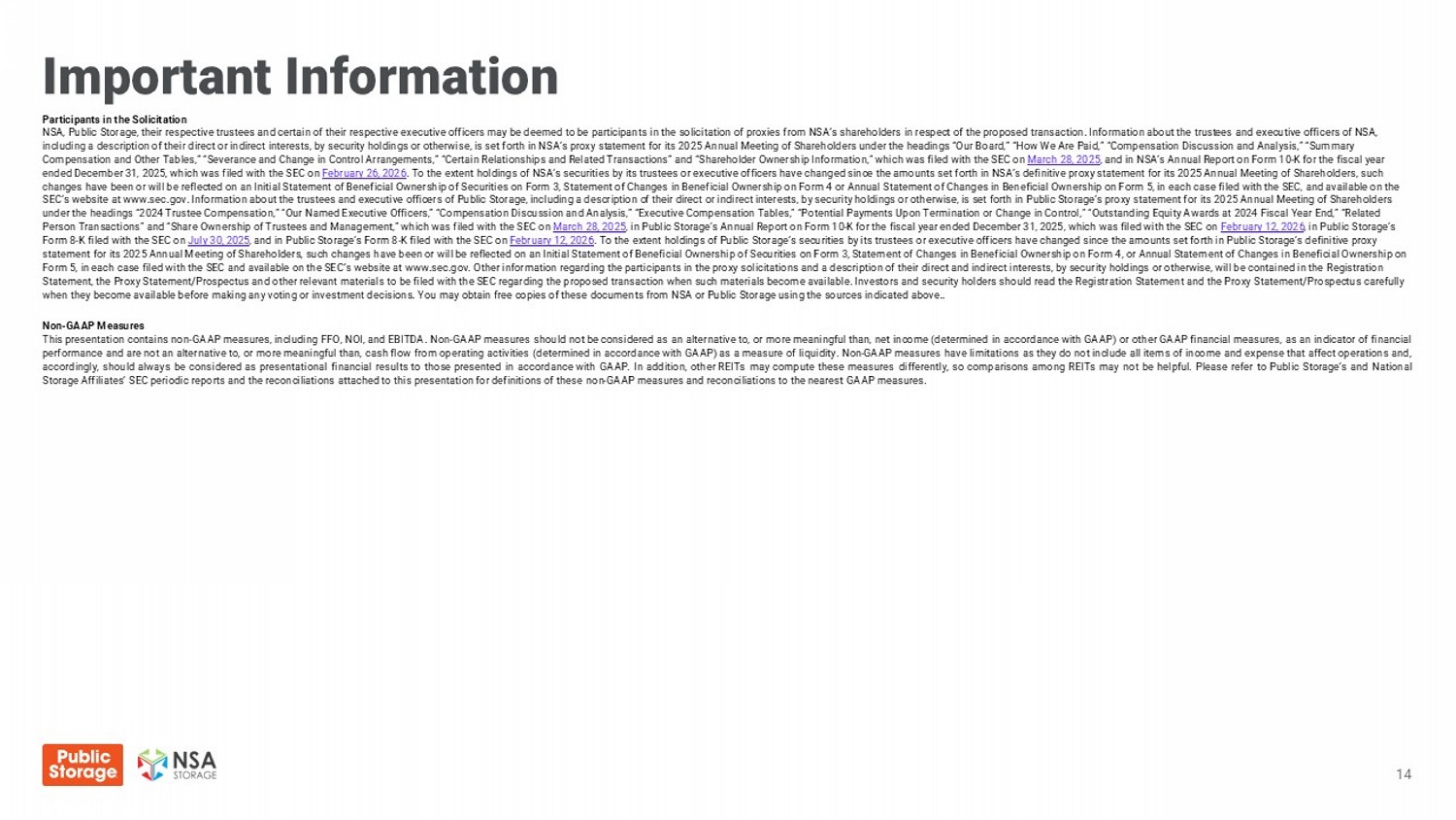 13 Important Information Cautionary Statement Regarding Forward - Looking Statements This communication contains “forward - looking statements” within the meaning of Section 27 A of the Securities Act of 1933 , as amended (the “Securities Act”), and in Section 21 E of the Securities Exchange Act of 1934 , as amended, which are based on current expectations, estimates and projections about the industry and markets in which National Storage Affiliates Trust (“NSA”) and Public Storage operate, as well as beliefs and assumptions of NSA and Public Storage . Words such as “anticipate,” “become,” “believe,” “could,” “estimate,” “expect,” “forecast,” “intend,” “may,” “outlook,” “plan,” “potential,” “possible,” “predict,” “project,” “target,” “seek,” “shall,” “should,” “will,” or “would,” including variations of such words and similar expressions, are intended to identify forward - looking statements . All statements that address operating performance, events or developments that NSA or Public Storage expects or anticipates will occur in the future are forward - looking statements, including statements relating to any possible transaction between NSA and Public Storage, rent and occupancy growth, acquisition and development activity, acquisition and disposition activity, general conditions in the geographic areas where NSA and Public Storage operate, NSA’s and Public Storage’s respective debt, capital structure and financial position and NSA’s and Public Storage’s respective ability to form new ventures . Such forward - looking statements are not guarantees of future performance and involve known and unknown risks, uncertainties, assumptions and other factors that are difficult to predict and may cause the actual results to differ materially from future results expressed or implied by such forward - looking statements . Important factors, risks and uncertainties that could cause actual results to differ materially from such plans, estimates or expectations include but are not limited to : ( i ) the parties’ ability to complete the proposed transaction on the proposed terms or on the anticipated timeline, or at all, including risks and uncertainties related to NSA’s ability to obtain the required shareholder and unitholder approval, and the parties’ ability to satisfy the other conditions to consummating the proposed transaction ; (ii) the inability to realize the anticipated benefits of the proposed transaction, including as a result of delay in completing the proposed transaction ; (iii) the risk that NSA’s business will not be integrated successfully with Public Storage’s or that such integration may be more difficult, time - consuming or costly than expected ; (iv) significant transaction costs and/or unknown or inestimable liabilities ; (v) potential litigation relating to the proposed transaction that could be instituted against NSA or its trustees, managers or officers, including resulting expense or delay and the effects of any outcomes related thereto ; (vi) the risk that disruptions from the proposed transaction, including diverting the attention of NSA and Public Storage management from ongoing business operations, will harm NSA’s and Public Storage’s businesses during the pendency of the proposed transaction or otherwise ; (vii) certain restrictions during the pendency of the business combination that may impact NSA’s and Public Storage’s ability to pursue certain business opportunities or strategic transactions ; (viii) the possibility that the business combination may be more expensive to complete than anticipated, including as a result of unexpected factors or events ; (ix) the occurrence of any event, change or other circumstance that could give rise to the termination of the merger agreement, including in circumstances requiring NSA to pay a termination fee ; (x) the effect of the announcement of the proposed transaction on the ability of NSA and Public Storage to operate their respective businesses and retain and hire key personnel, and to maintain favorable business relationships ; (xi) risks related to the market value of Public Storage common stock to be issued in the proposed transaction ; (xii) other risks related to the completion of the proposed transaction and actions related thereto ; (xiii) potential business uncertainty, including changes to existing business relationships, during the pendency of the business combination or otherwise that could affect NSA’s or Public Storage’s financial performance ; (xiv) other risks related to the completion of the proposed transaction and actions related thereto ; (xv) legislative, regulatory and economic developments ; (xvi) unpredictability and severity of local, regional, national and international economic, political and catastrophic climates, conditions and events, including but not limited to acts of terrorism, outbreaks of war or hostilities or pandemics, as well as management’s response to any of the aforementioned factors ; (xvii) changes in global financial markets, interest rates and foreign currency exchange rates ; (xviii) increased or unanticipated competition affecting NSA’s or Public Storage’s properties ; (xix) risks associated with acquisitions, dispositions and development of properties, including increased development costs due to additional regulatory requirements related to climate change ; (xx) maintenance of Real Estate Investment Trust status, tax structuring and changes in income tax laws and rates ; (xxi) risks related to NSA’s and Public Storage’s investments in ventures, including NSA’s and Public Storage’s respective abilities to establish new ventures ; (xxii) environmental uncertainties, including risks of natural disasters ; (xxiii) those risks and uncertainties set forth in NSA’s and Public Storage’s Annual Reports on Form 10 - K for the year ended December 