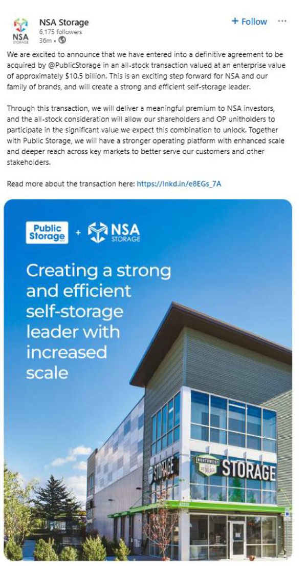 The following was posted to National Storage Affiliates Trust’s (“NSA”) Corporate LinkedIn account on March 16, 2026, in connection with Public Storage’s proposed acquisition of NSA.