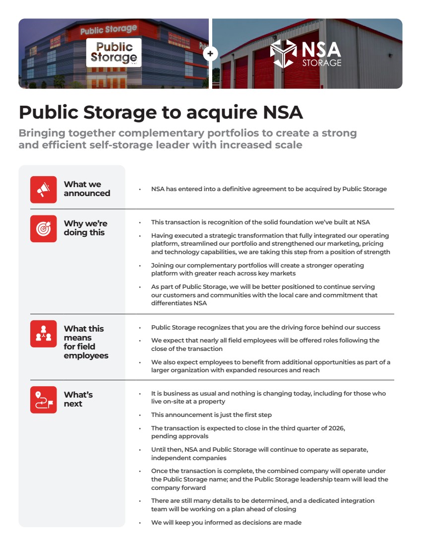 + What we announced • NSA has entered into a definitive agreement to be acquired by Public Storage Why we’re doing this • This transaction is recognition of the solid foundation we’ve built at NSA • Having executed a strategic transformation that fully integrated our operating platform, streamlined our portfolio and strengthened our marketing, pricing and technology capabilities, we are taking this step from a position of strength • Joining our complementary portfolios will create a stronger operating platform with greater reach across key markets • As part of Public Storage, we will be better positioned to continue serving our customers and communities with the local care and commitment that differentiates NSA What this means for field employees • Public Storage recognizes that you are the driving force behind our success • We expect that nearly all field employees will be offered roles following the close of the transaction • We also expect employees to benefit from additional opportunities as part of a larger organization with expanded resources and reach What’s next • It is business as usual and nothing is changing today, including for those who live on-site at a property • This announcement is just the first step • The transaction is expected to close in the third quarter of 2026, pending approvals • Until then, NSA and Public Storage will continue to operate as separate, independent companies • Once the transaction is complete, the combined company will operate under the Public Storage name; and the Public Storage leadership team will lead the company forward • There are still many details to be determined, and a dedicated integration team will be working on a plan ahead of closing • We will keep you informed as decisions are made Bringing together complementary portfolios to create a strong and efficient self-storage leader with increased scale Public Storage to acquire NSA